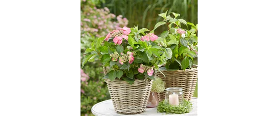 Die wohl bekannteste Hortensienart ist die Bauernhortensie (Hydrangea macrophylla). Sie wurde Ende des 18. Jh. von Japan nach Europa gebracht. Niemand möchte sie aufgrund der romantischen, bunten Blüten im Garten missen. Ihre üppigen Blütenkugeln zeigen sich in den Farben Blau, Rosa, Rot, Rotpink oder Weiß. Eine der beliebtesten Sorten ist *'Endless Summer®'*, da diese die Fähigkeit besitzt, bereits an frischen Trieben Blüten zu bilden. Die großen Dolden des bis zu 2 m hohen Halbstrauches blühen von Juni bis Oktober. Die pflegeleichte und wuchsfreudige Pflanze fühlt sich im nährstoffreichen Boden am wohlsten. Überwintern Sie die Gartenhortensie mit Reisig oder einer Vlieshaube. Im Topf eingepflanzte Hortensien überwintert man am besten in einer ungeheizten Garage.
