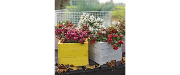 Dank des reichen Fruchtschmuckes gehören die Fruchtmyrte (Pernettya mucronata) und die Scheinbeere (Gaultheria procumbens) zu den beliebtesten Pflanzen im Herbst. Die immergrüne Fruchtmyrte beeindruckt mit ihren auffallenden, weißen oder rosa bis rotfarbenen Beeren, die bis in den Winter hinein an den Zweigen hängen bleiben. Die Früchte heben sich deutlich von den grünen Blättern der Pflanze ab und bilden somit einen hübschen, farb-lichen Kontrast. Die etwa bis 60 cm hoch werdende Pflanze bevorzugt einen sauren Boden.
