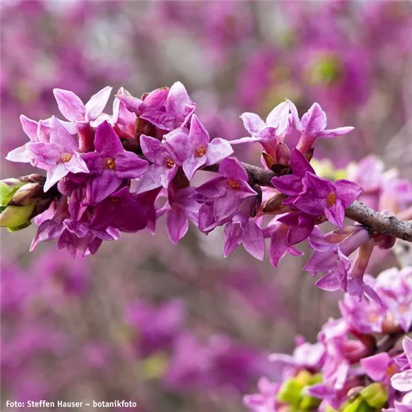 Der Echte Seidelbast (Daphne mezerum) ist ein heimischer Strauch, der meist eine Höhe von einem Meter oder etwas darüber erreicht. Der Strauch blüht im Frühjahr mit duftenden rosa-roten Blüten. Im August bis September entwickeln sich leuchtend rote Beeren, die zwar schön, aber sehr giftig sind.