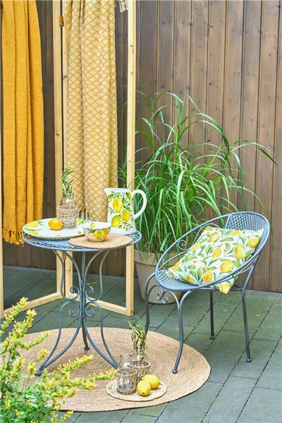 Stimmung auf Terrasse und Balkon. Sommerliche Zitronenmotive auf Teller und Kissen geben Ihrem