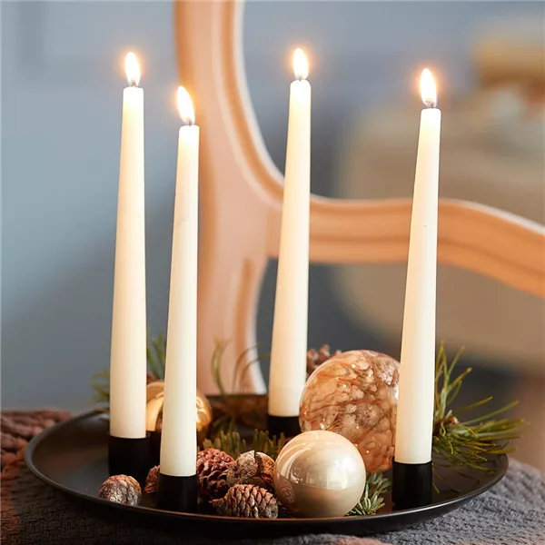 Modern im Design ist der Teller mit Magnetkerzenhalter vielseitig einsetzbar. Die Spitzkerzen können immer wieder neu arrangiert werden. Wer mag, der verwendet auch nur eine Kerze in der Mitte und schmückt den Teller mit Kugeln, Zapfen oder Nüssen. Der schwarze Metallteller passt sich wunderbar jedem Anlass an – auch an Ostern z. B. mit Eiern und Federn geschmückt.